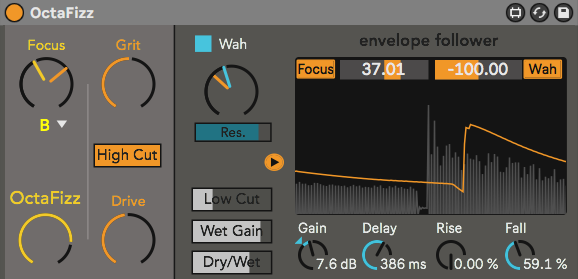 The default settings provide a nice classic octafuzz tone/behavior where octaves are more prominent the more you play up the neck (around the 12th fret and up), but you're obviously encouraged to tweak (check Live's info view for details about each parameter) and abuse parameters to get insanely useless sounds!