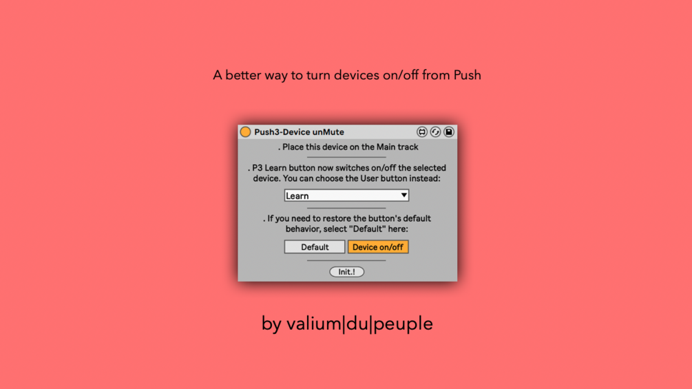 Instead of the default 2-hands gesture (hold Mute and press a device's selector button), Push3-Device unMute repurposes the (useless) Learn button which is then used to turn on/off the currently selected device. Simple as that. You can use the User button if you prefer.